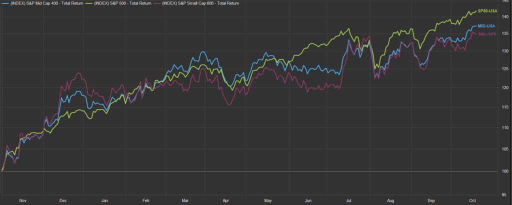 Many investors think of the Dow Jones 30 Industrials Average as “the market.” It is the oldest index—dating back to the 1890s—but it only represents 30 companies. A broader view of the market to measure breadth are three indexes: S&P 500 (large capitalization, green line), the S&P 400 (mid-size caps, blue line) and the S&P 600 (smaller caps, red line). Together, these 1500 stocks comprise more than 90% of the market value of all stocks trading in the US.