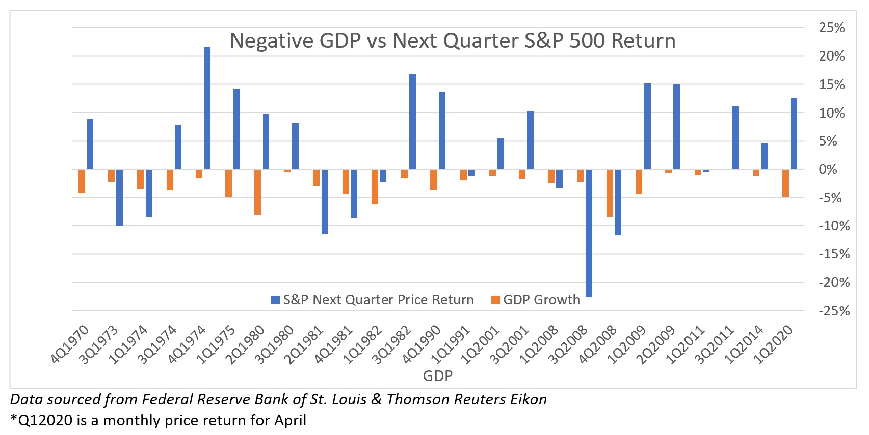 The chart below shows the 25 quarters the US experienced negative GDP growth in the last 50 years. The blue bars represent the S&P 500 price return for the quarter immediately following negative GDP. 15 of the 25 quarters in which GDP contracted were followed by gains in the S&P 500 index*. The observation here is markets are forward-looking. Last quarter’s weak economic data does not mean this quarter’s stock performance will be weak as well.