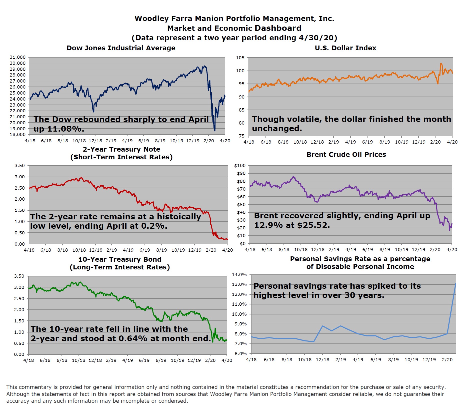 April was a historic month for the US economy, as the coronavirus continued to grind parts of the economy to a halt. 20 million Americans filed initial unemployment claims, benchmark oil prices went negative for a short period, and the 1st Quarter GDP report, released April 29th, showed a -4.8% contraction. Despite the flurry of bad news, the S&P 500 continued to rebound from March lows, rising 12.7% in April, ending 14.2% below the February all-time high. Many have been quick to point out the divergence in economic conditions and stock market performance. At the risk of oversimplifying, this can largely be explained by a basic feature of purchasing securities: future value. Markets are forward- looking as investors weigh decisions on the future dividends, interest, or capital gains they expect to receive. The economic toll exacted by coronavirus was being “priced in” (anticipated) during the February-March selloff. The rebound is a signal of improving investor sentiment for the future.