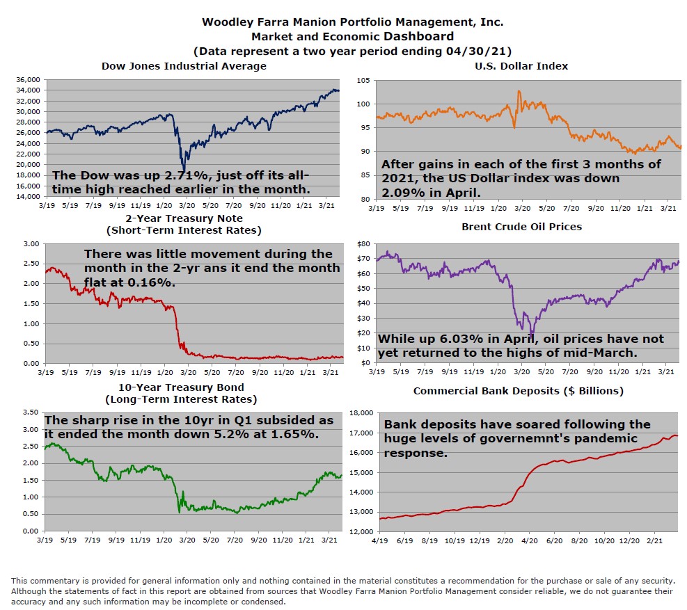 The S&P 500 advanced 5% in April as treasury yields stabilized following a significant run-up in the first quarter. First quarter GDP results were released at the end of April, showing 6.4% real growth and 10.7% nominal growth, annualized. Retail sales and goods consumption soared in March as more stimulus boosted personal incomes. The wave of consumption has further stretched COVID-impacted supply chains and inventories. In response to tight supply and robust demand prices have moved higher – particularly for industrial & construction commodities. Copper, lumber, steel, and aluminum prices are all much higher than before the pandemic. As commodity producers, manufacturers, and retailers scramble to meet demand, they have ramped up hiring and job postings. March employment rose over 900,000, marking the best month for job gains since August. Job openings now exceed pre-COVID levels, as employers attempt to entice individuals into returning to the labor force.