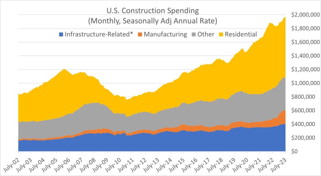 U.S. economic data continued to come in strong, albeit aided by widening federal budget deficits, which has a stimulative effect on the economy. Consumer spending has continued to grow at a healthy 2%+ clip on an inflation-adjusted basis. Federal spending has shifted from direct payments to households during the pandemic to corporate incentives and contracts for infrastructure, defense, and manufacturing. Perhaps nowhere is this shift more apparent than in construction spending data. U.S. construction spending has continued to climb despite higher interest rates and a sluggish housing market. While residential construction spending was -5.4% y/y in July (latest available), non-residential construction was up 16.5% y/y. Construction spending in manufacturing was up a whopping 71% y/y. Reshoring trends are very real. Infrastructure-related* spending rose 9.3% y/y.