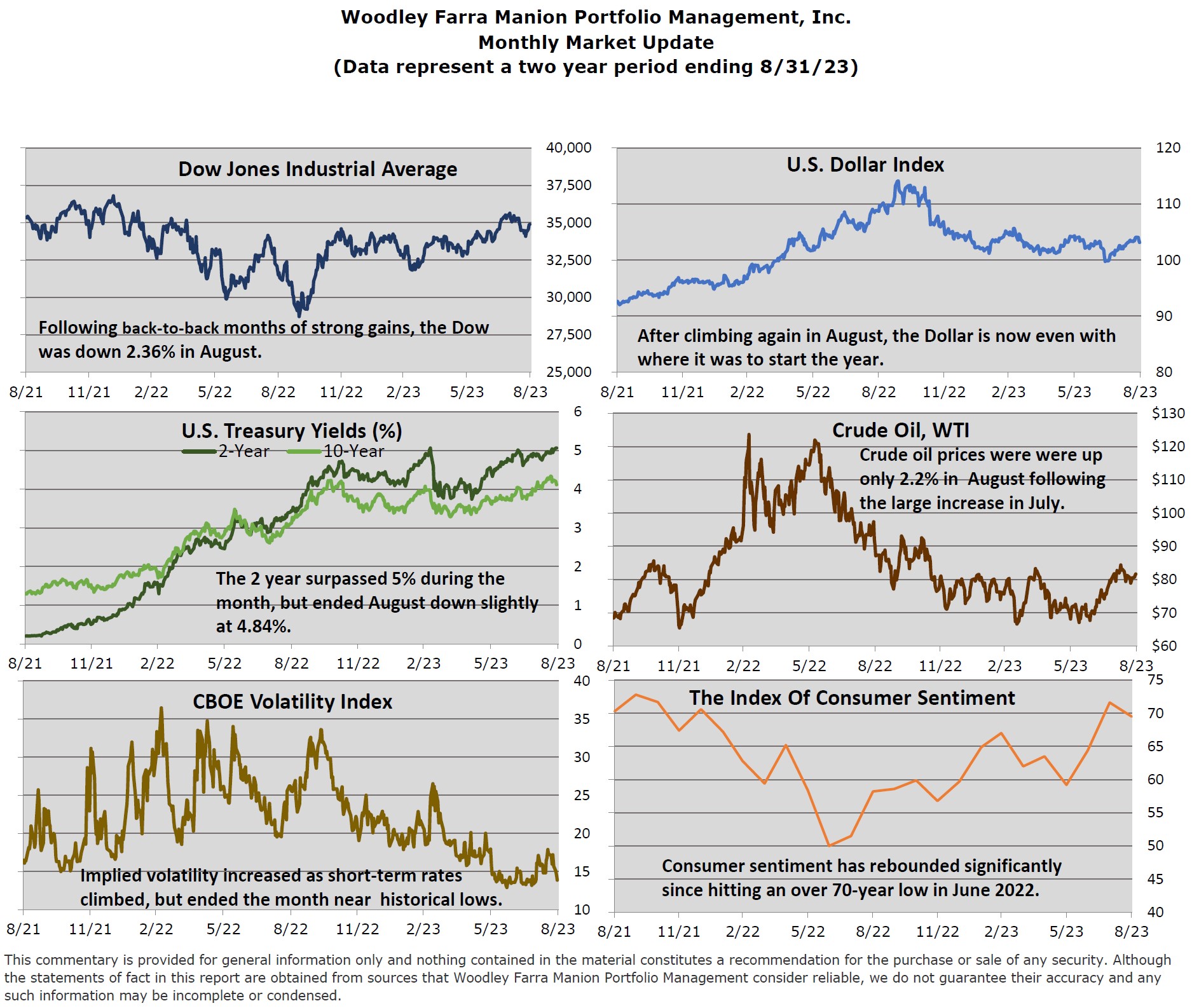 Stocks sold off in early August as bond yields climbed. The S&P 500 index was down 5% from the end of July through August 18th as the 10-year U.S. Treasury yield reached its highest level since 2007, exceeding 4.3%. The S&P 500 clawed back some of its August losses in the latter half of the month, to end down 1.8%, as the 10-year yield pulled back to below 4.1%.