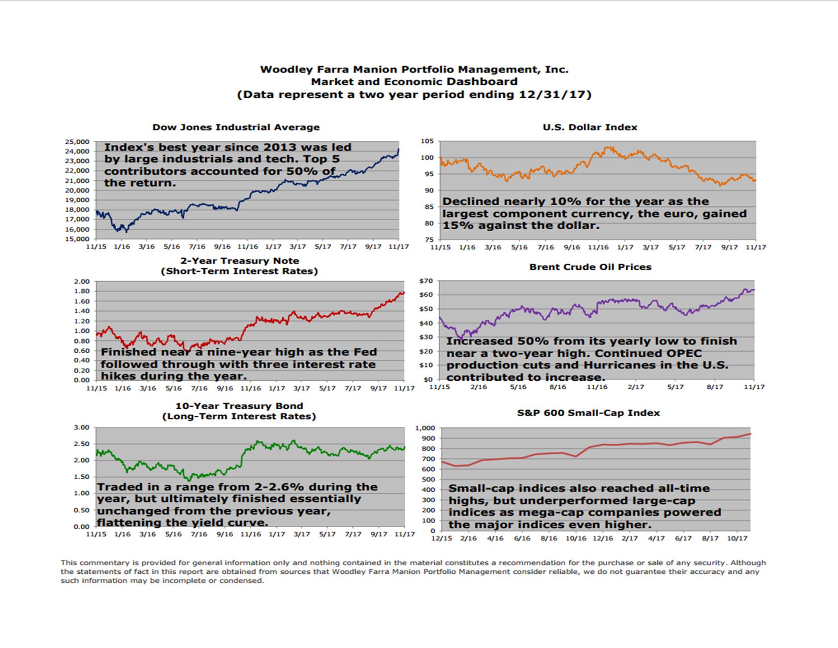 Happy New Year! 2017 turned out to be one of the best years for stocks since the bull market began in March of 2009. Market advances were broad-based, as small, mid-size and large company indexes all reached new all-time highs, as did many international markets. Even long-time laggard Japan reached new multi-year highs in the Nikkei index.