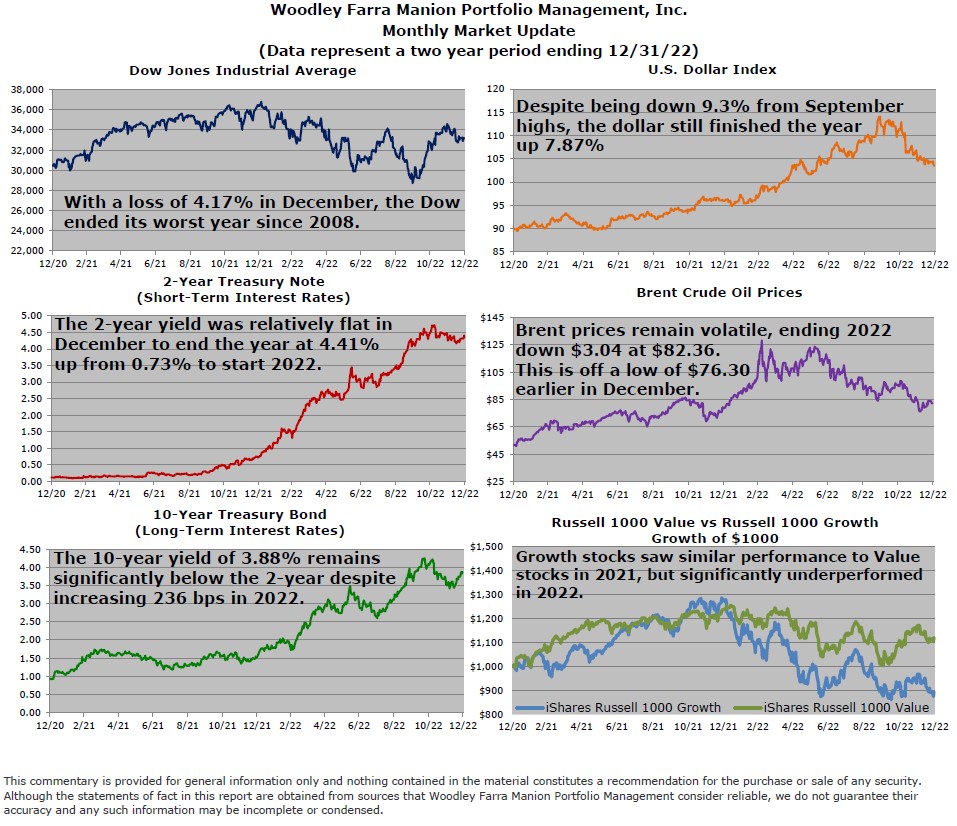 2022 was the year markets were reminded of the risks posed by high inflation. Unfortunately for investors, this reminder came at a cost. Higher interest rates, intended to address high inflation, had an adverse effect on stock and bond performance. Bond prices move inversely to interest rates, so as rates rise, bond prices fall. The Bloomberg U.S. Aggregate Bond Index had its worst year on record, going back to 1976, falling 13%. The S&P 500 stock market index fell 18%. In January 2022, markets were expecting the (short-term) fed funds rate to end the year around 1%. But as the “transitory inflation” narrative lost credibility, the Federal Reserve engaged in one of the fastest U-turns in interest rate policy ever, causing the fed funds rate to blow past expectations and end the year over 4%.