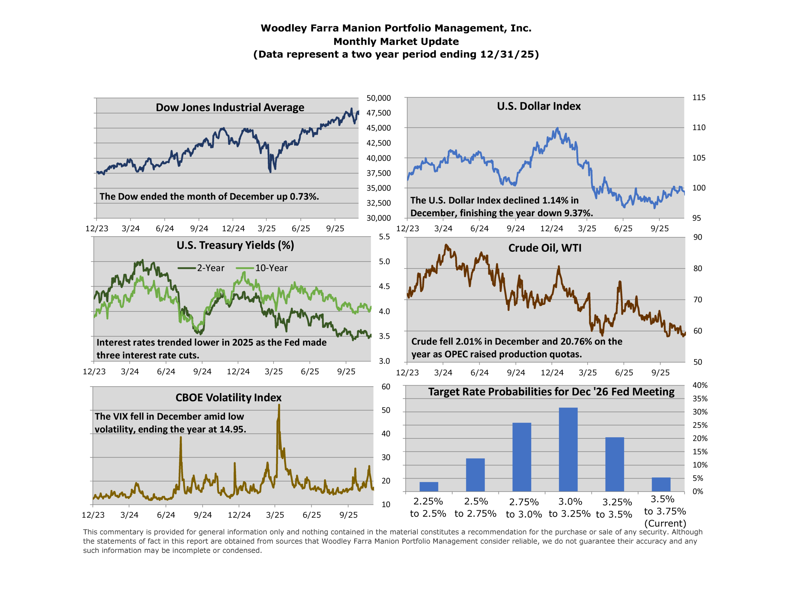 Falling interest rates provided a tailwind to markets in 2025. The Federal Reserve cut the short-term benchmark rate in September, October, and December, totaling 0.75% in cuts. Longer-term rates also dropped, with the 10-year US Treasury yield 0.43% lower on the year. All else equal, lower interest rates support higher valuations and earnings for stocks. Looking ahead, interest rate futures imply a ~75% chance of at least another 0.5% in rate cuts in 2026.