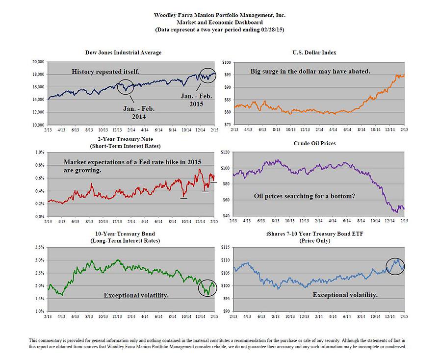 The stock market’s performance has started the New Year in much of the same manner as it did in 2014, with a large decline in January, followed by a sharp rally in February. Among the culprits for the year’s decline was the election of a new government in Greece that pledged to undo the harsh austerity program imposed by the European Union in 2011, continued drops in oil prices and an extended market condition that needed to take a breather anyway. February saw a reversal of some of these factors and the month enjoyed one of its best gains in over 17 years.