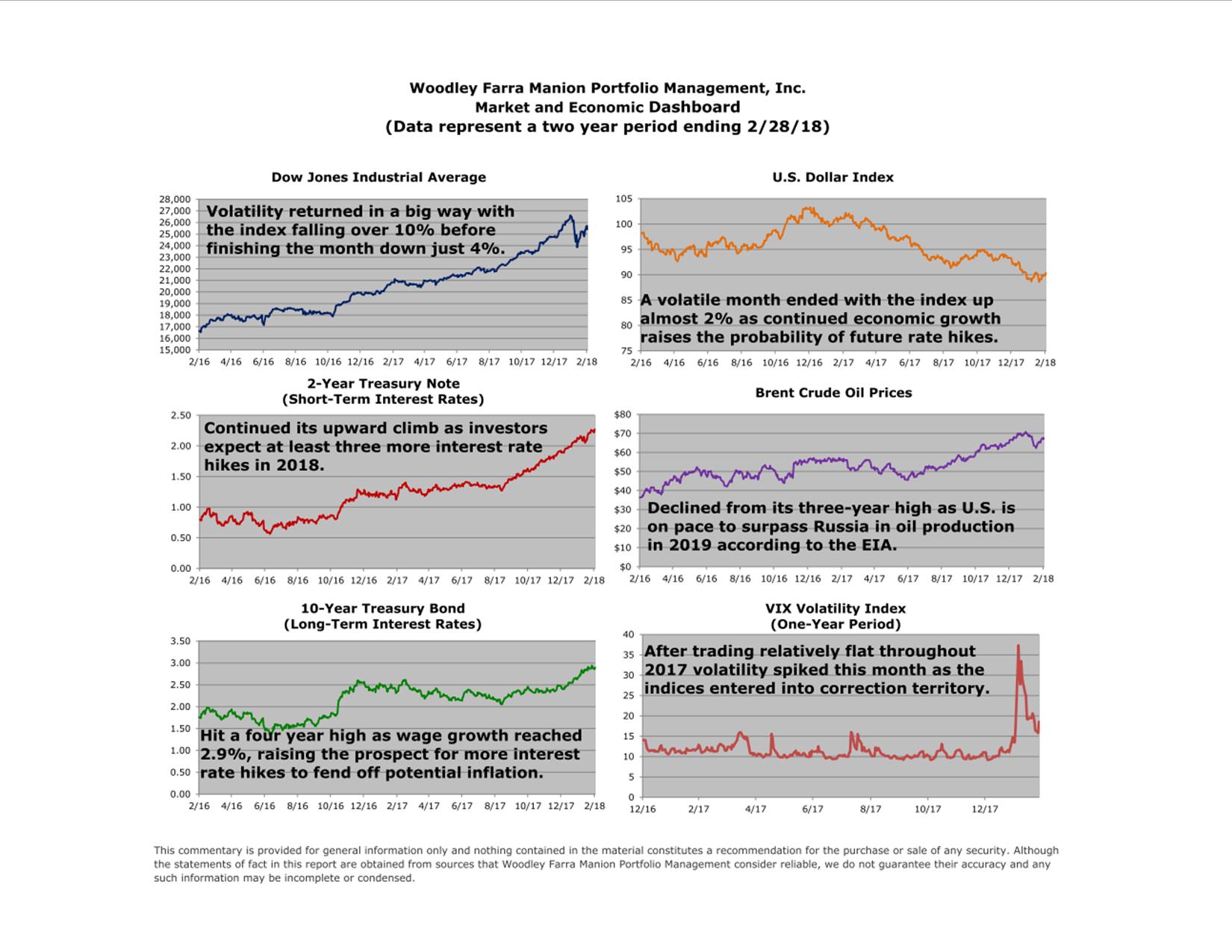 In last month’s Dashboard we talked about the S&P 500’s historically high level above its 200-day moving average. Couple this with a move higher in interest rates and it’s no surprise that volatility spiked and stocks entered correction mode. While the 12% decline happened a lot faster than even we had anticipated, a bullish technical signal occurred when the index held at the 200-day moving average and began to recoup some of the losses. While we’re definitely paying attention to interest rates, a strong economy and lower taxes should continue to provide support to equity prices going forward.
