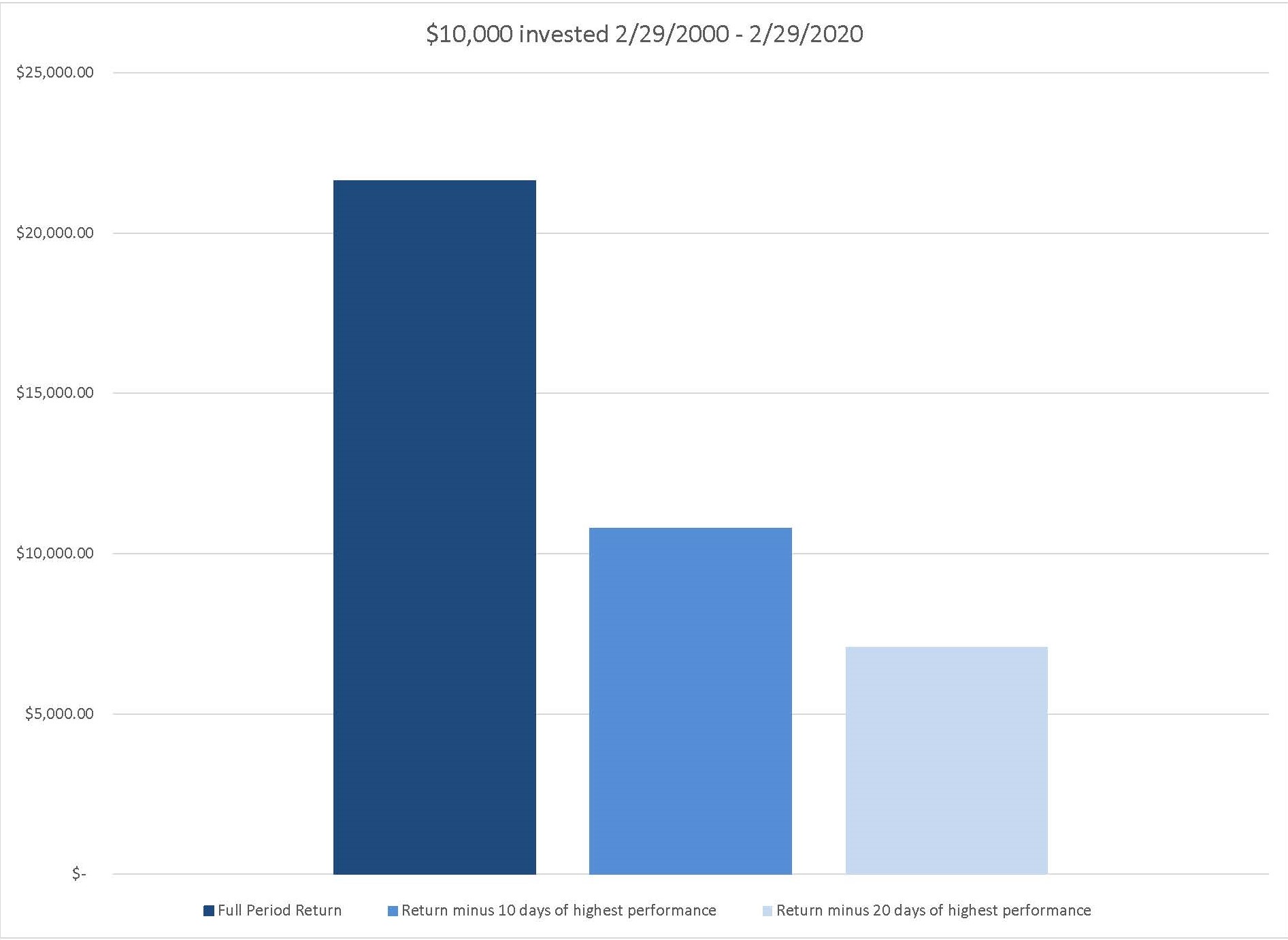 So far, 2020 has reminded us of the price (volatility) investors pay for the reward of historically superior long-term stock returns. The most widely followed volatility measure reached two-year highs as the S&P 500 fell nearly 16% in a few days. Attempting to play daily swings in the market during periods of high volatility is often a losing endeavor. Selling near a bottom is one of the most destructive portfolio actions an investor can take, as they endure losses on the way down and miss gains on the way back up. The graph below highlights the importance of participating in the market’s biggest up days, many of which follow or coincide with downturns. An investor would have barely made money in the past 20 years had they missed out on the market’s 10 best days. History shows patience has paid off during these times of intense volatility. Stay patient.
