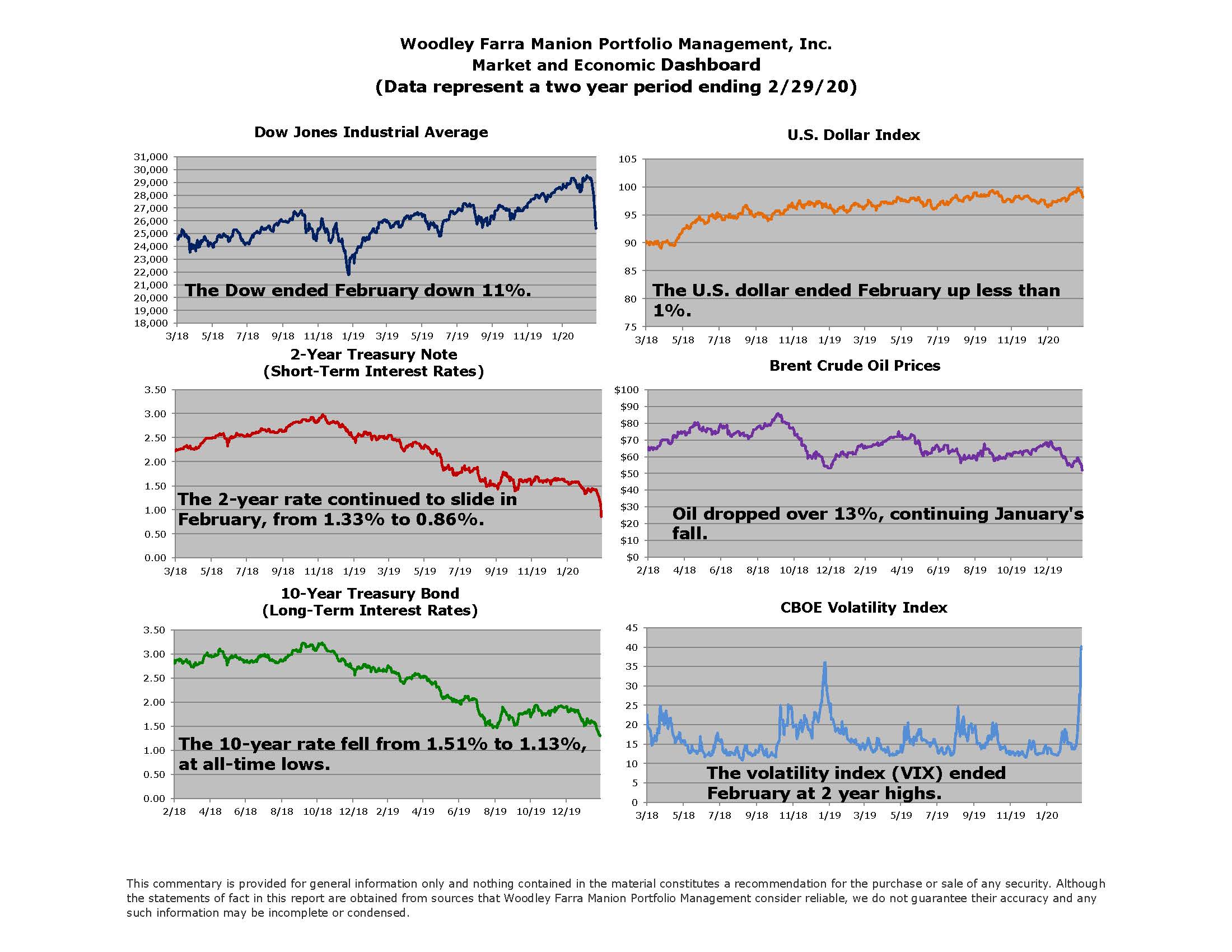 Last month’s letter mentioned the coronavirus’ potential to infect global supply chains. February showed the risk materializing along with more widespread impacts on travel. The Federal Reserve’s 0.50% rate cut on March 3rd did little to assuage investors, highlighting the limitations of monetary policy tools in “treating” the virus. Nevertheless, consumers are enjoying the benefits of record low interest rates and energy costs. Consumer behavior will likely be the most important economic determinant in the next few months as they either continue to spend or change habits in response to virus concerns. If there is one thing markets hate, it’s uncertainty. Markets have thus far struggled to evaluate the potential depth and duration of risks posed by the virus. As time passes, scientists and markets will gain a better understanding of mortality rates, treatment options, vaccine potential and warm weather’s ability to reduce the rate of spread. This information should reduce uncertainty, and therefor volatility.