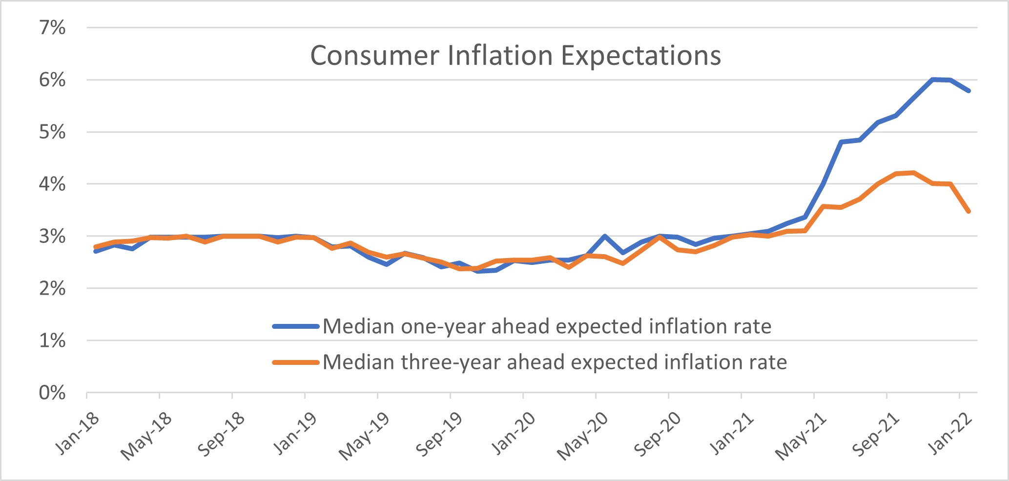 With the U.S. entering its second year of higher-than-normal inflation, the Federal Reserve faces increasing pressure to adjust monetary policy. High inflation expectations among consumers and businesses can create a feedback loop whereby wages and producer prices are negotiated higher, spurring continued inflation. This upward spiral can lead to “sticky” inflation that becomes more difficult to combat with policy actions. It’s also why the Fed pays close attention to consumers’ inflation expectations. The chart below shows survey results of consumer inflation expectations for the next one (blue) and three (orange) years. Recent results (through January) showed moderating inflation expectations, although surveyed inflation uncertainty was as high as ever. Consumers also continued to view at least some of the inflation as near-term, as shown by the lower three-year (annualized) inflation expectation.