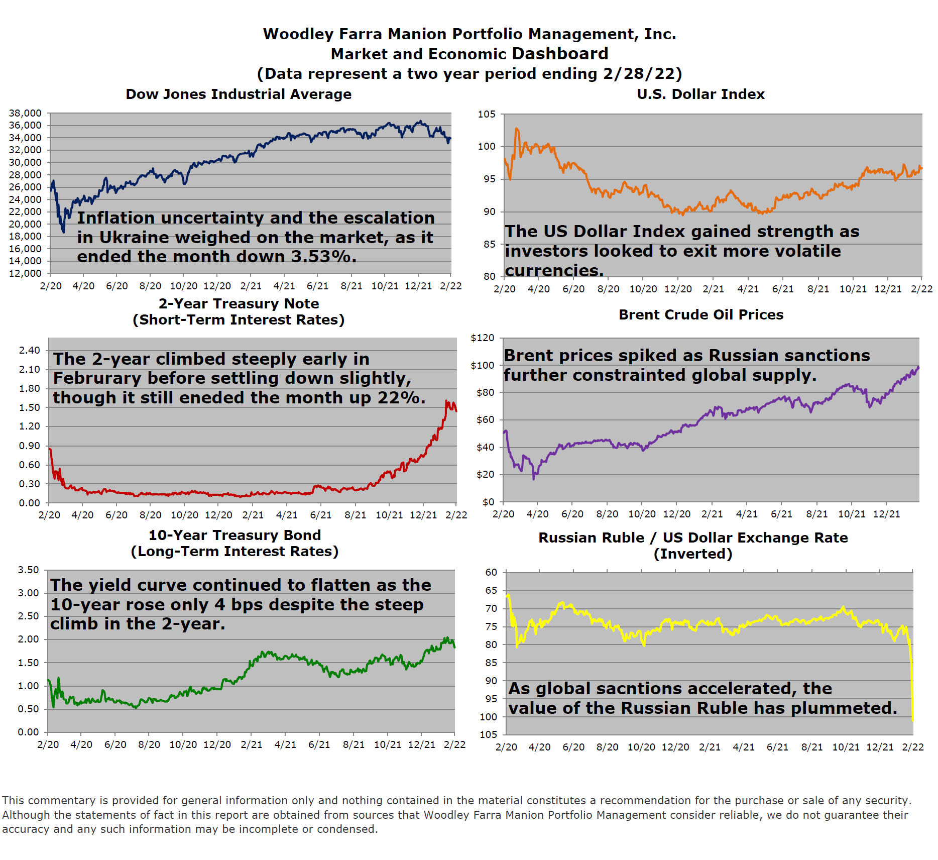 The Russia-Ukraine conflict dominated financial headlines in February, leading to modest declines for U.S. stock indices. Interest rates continued to climb most of the month but dropped following the invasion. Mounting international sanctions have put the Russian Ruble into free-fall, as businesses and individuals rush to sell Russian assets. The U.S. economy and stock market stand in a position of relative strength vs Europe and many other parts of the world. Many U.S. corporations scaled back investment in Russia following the 2014 invasion of Crimea and the ensuing sanctions. Russia doesn’t crack the top 15 U.S. trading partners but is a major global commodity supplier. Key exports include oil, gas, steel, aluminum, wheat, platinum, and fertilizer. The war’s impact on inflation will be a concern for markets in the months ahead as supply chains face further disruption and commodity prices likely rise.