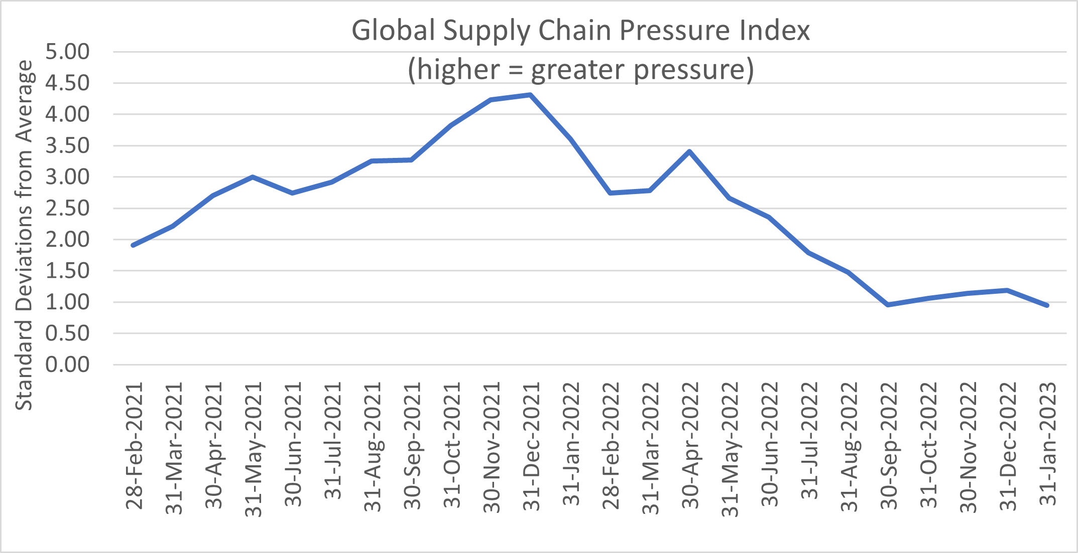 Earnings season, the period in which most companies reported their fourth quarter results and provided guidance on 2023 expectations, is now largely wrapped up. While results and expectations vary widely, executives are operating in an environment of slower revenue growth than in ’21 & ’22, but with continued cost & profit margin pressures. Nevertheless, cost pressures have abated somewhat, especially for companies more exposed to commodity costs and supply chain disruptions. Commodity prices have fallen dramatically from peaks in the first half of 2022. And the chart below shows the New York Fed’s Global Supply Chain Pressure Index2, which has moderated significantly since the end of ’21. Normalizing supply chains should help ease inflationary pressures, all else equal. Wages are proving to be a more persistent source of inflation than commodity and supply chain issues. Employment data is likely to be another example of “good news is bad news” for markets in the short term, with strong jobs and wage numbers potentially putting downward pressure on stocks and bonds.