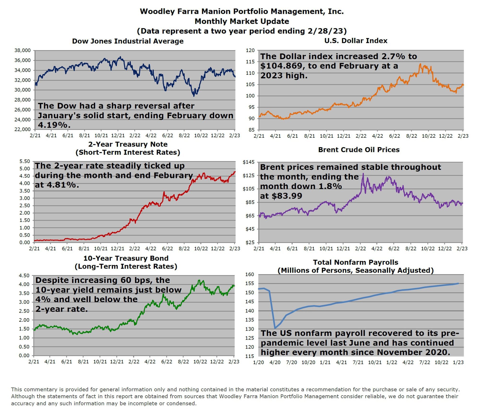 February was a case of good news is bad news, or to be more specific, good economic data was bad news for stocks and bonds. Economic data continues to point to a resilient US economy, shrugging off higher interest rates. Retail sales reaccelerated in recent months, with real (after inflation) incomes on the rise. Fourth quarter GDP grew at a seasonally adjusted annualized rate of 2.7%, according to the most recent estimate. First quarter 2023 GDP is expected to show similar growth1. The solid economic data drove renewed concerns of persistent inflation and, therefore, a Federal Reserve unlikely to back off rate hikes in the months ahead.