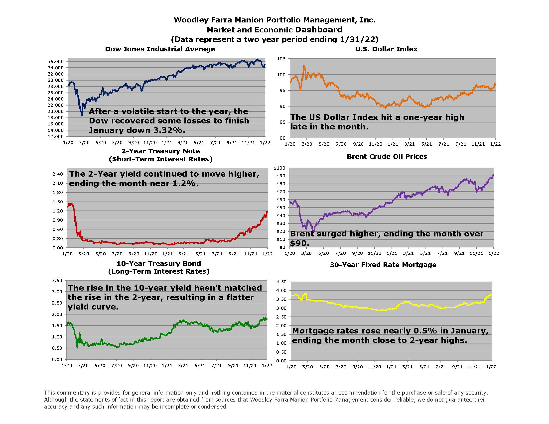 January was an eventful month in financial markets. Fourth quarter real GDP growth came in at 6.9% as businesses replenished inventory and consumer spending remained strong despite less government stimulus. The Federal Reserve continued to accelerate plans for interest rate hikes, signaling a likely first hike in March to combat inflation. How inflation responds to initial interest rate increases will provide insight into how high the Fed might take rates.