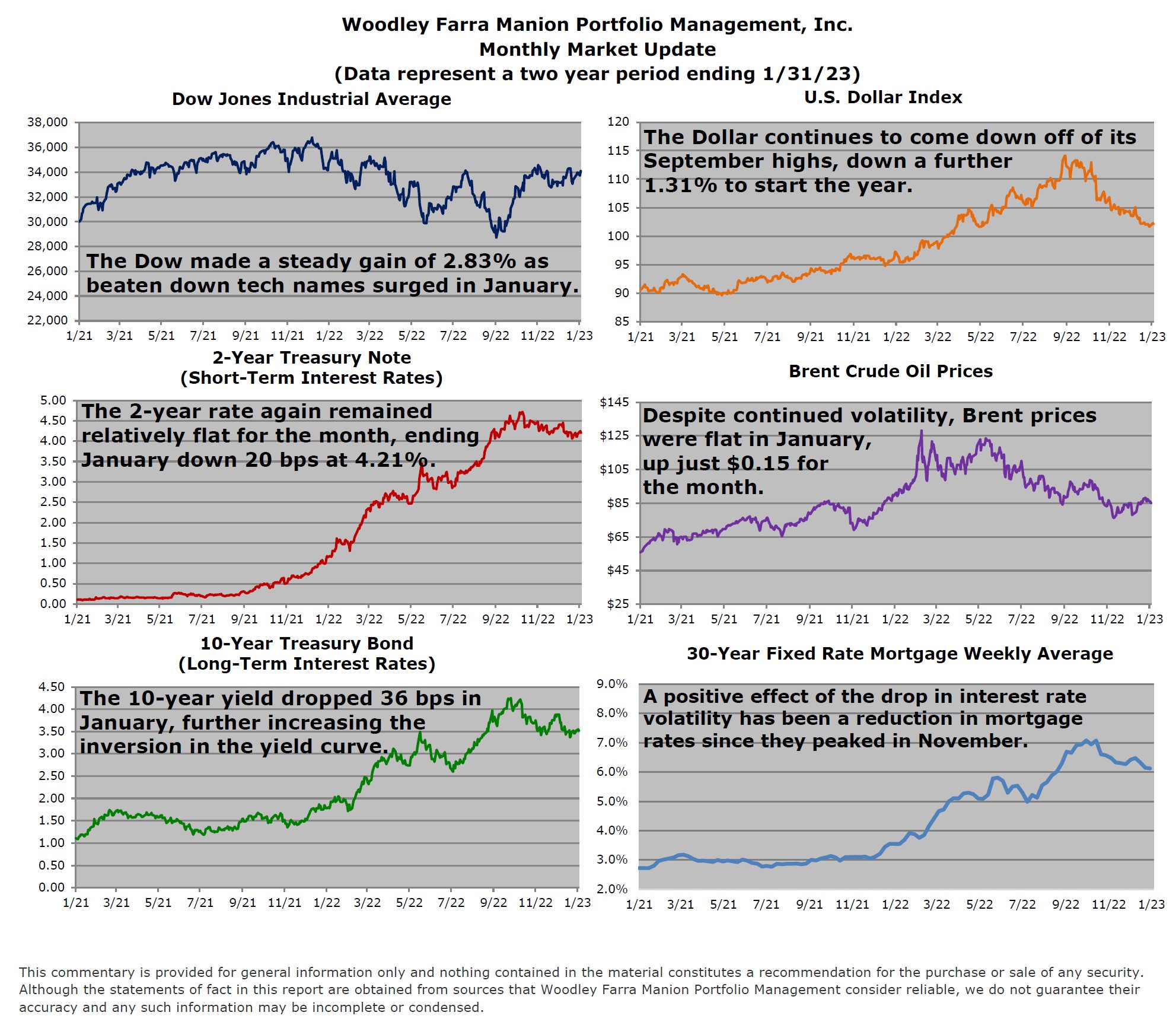 The U.S. economy continued to shrug off higher interest rates in the fourth quarter, growing 2.9% on a seasonally and inflation-adjusted, annualized basis. Thus far, weakness in a few segments of the economy (housing, used cars, technology) has been offset by strength elsewhere (travel, auto & aerospace manufacturing, energy). And despite tech layoffs grabbing new headlines, job openings have been rising in recent months, exceeding 11 million positions. While one month doesn’t make a year, January’s financial and economic data offered cause for optimism. The probability of achieving a soft landing – rate hikes to slow inflation, while avoiding a recession – has vastly improved in recent months.