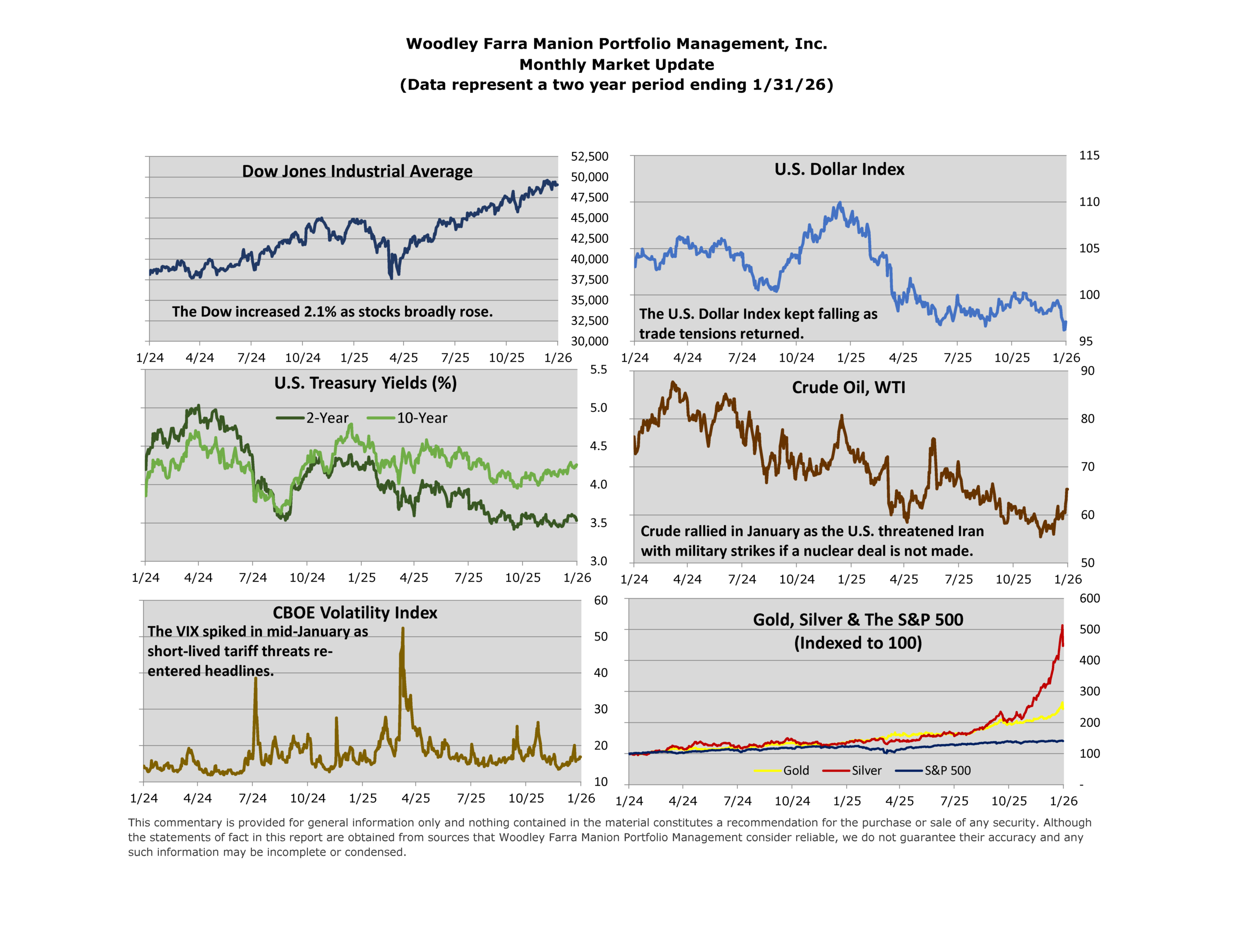 January marked a solid start to the year for markets with the S&P 500 closing up 1.4% and the Dow Jones closing up 2.1%. Unlike the concentrated trend of 2025, stocks seemed to broadly rise with the equal weight S&P 500 index outperforming the traditional S&P 500, which is weighted based on market size, by 2.2 percentage points. Some of the biggest tech names took a breather after a stellar 2025, with the Magnificent Seven only seeing an average increase of 0.4% in January.