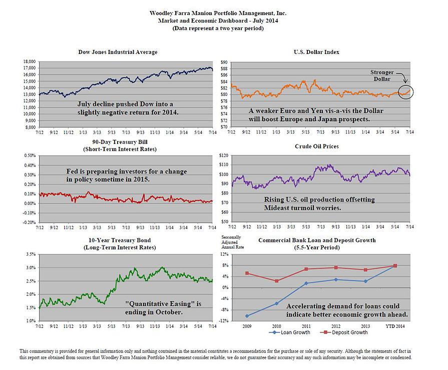 The lingering effects of the severe winter of 2014 were shrugged off as the second quarter’s first read on economic growth showed an annualized gain in GDP of 4% (much better than expected), compared to an annualized decline of 2.9% for the first quarter. Economic gains were widespread for both consumer and business spending, along with higher state/local government expenditures. After so many quarters of lower than expected growth, the snapback from the winter blues is a welcome development.