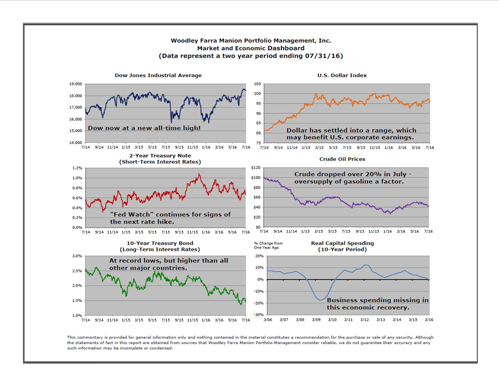 The strong (yet improbable) post-Brexit rally continued into mid-July, buoyed by a swift installation of a new government in London and improving economic indicators in the US, Europe and Japan. US stocks reached new all-time highs on July 20th, representing a rally of nearly 9% from the post-Brexit lows of June 27th. Stocks began to finally cool-off near the end of the month, taking a well-deserved breather.