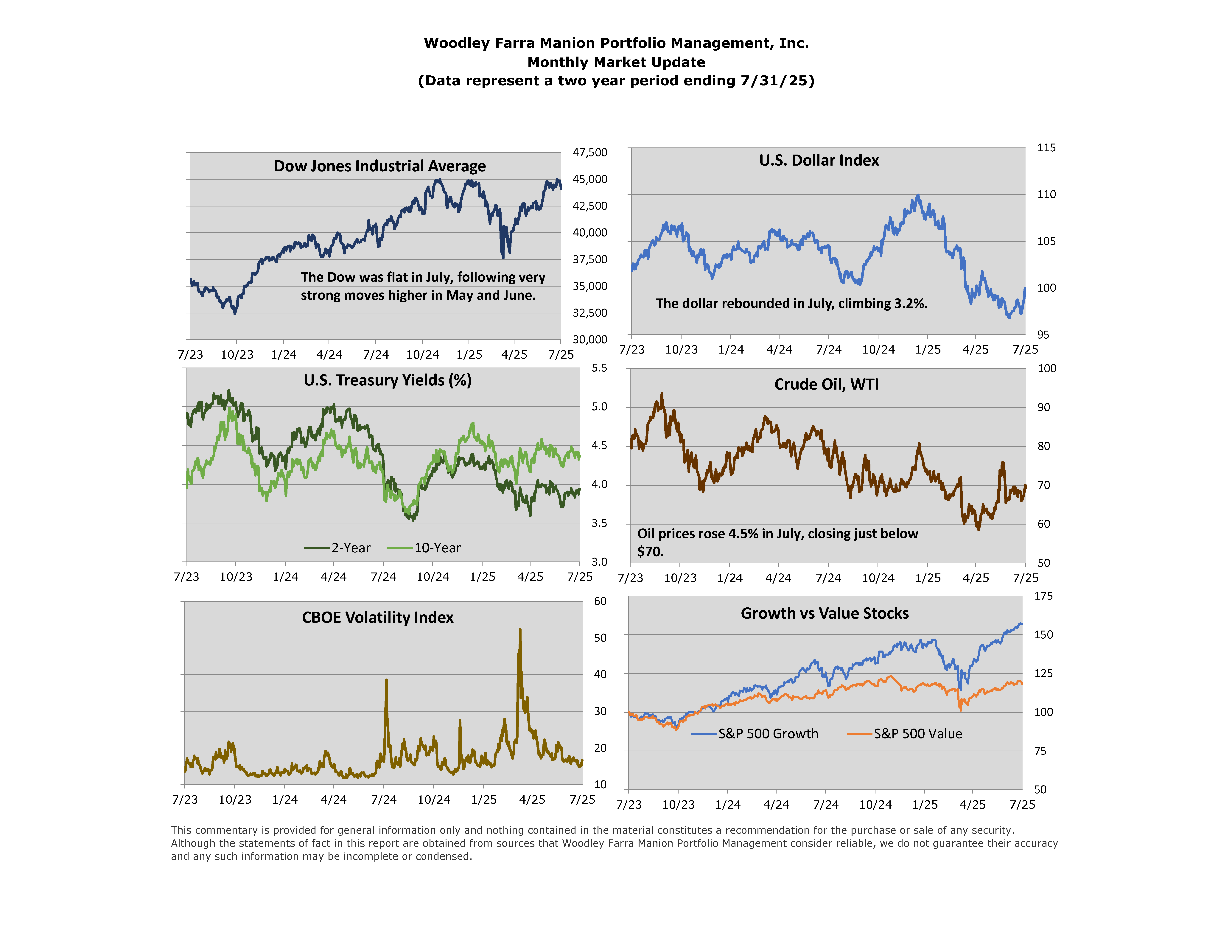 Stocks crept higher through July, with the S&P 500 notching numerous successive all-time highs and closing up 2.2% from the end of June. One driver of the market’s performance was favorable tariff news. Notable trade deals were announced with major U.S. trading partners in July, namely Japan, South Korea, and the European Union. The market also digested the beginning of earnings season. Continuing AI investment propelled tech names while consumer-related companies expressed some caution.