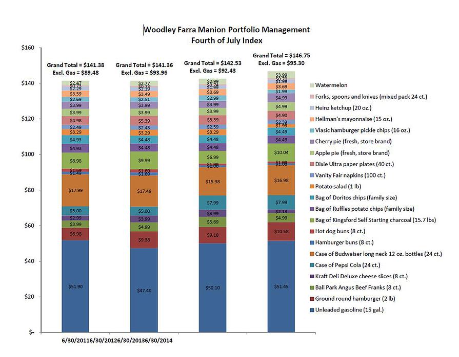 Welcome to the fourth installment of our Fourth of July Index. The annual survey performed by our firm is intended to give a real-life example of the changes in prices of a variety of grocery items needed for a typical picnic in celebration of Independence Day. We include the cost of a tank of gas to account for a round-trip between home and the picnic destination.