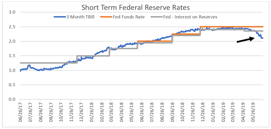 The chart above is indicative of why the market is expecting a rate cut. The Fed has several tools to manage short-term interest rates (Fed Funds rate) and the money supply (interest paid on excess bank reserves). The Fed began to pay interest on the latter during the 2008 Financial Crisis and has continued this program as an outlet for banks to earn extra income on funds they are not lending.