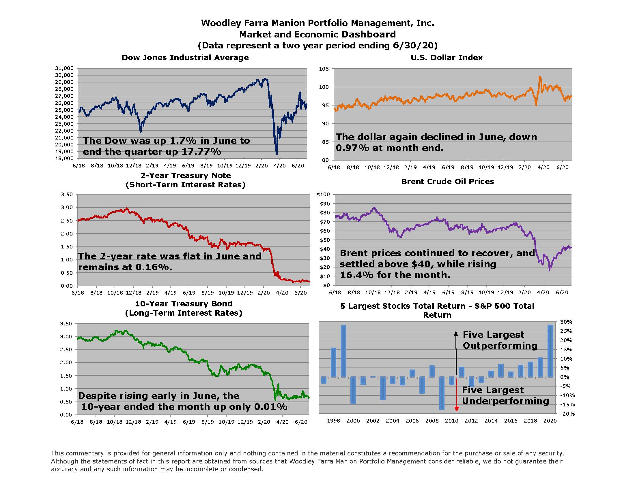 A big surprise this year has been the huge outperformance and growing weights of the five largest companies relative to the rest. The S&P 500 is a market capitalization (size) weighted index of the 500 largest US companies. The five largest companies now make up roughly 22% of the index (highest weight in 40 years). It has been over 20 years since the five largest companies outperformed the overall S&P 500 by as wide a margin as 2020, as shown in the chart in the Dashboard chart above. An equal weighted index of the same S&P 500 companies is -10.8% year-to-date vs -3.1% for the cap/size weighted version. This illustrates how impactful Apple, Microsoft, Amazon, Alphabet, and Facebook’s (five largest companies) recent performance has been on the market at large. How long this trend may continue is debatable, though like all trends, the outperformance will eventually end. What the market needs going forward is a larger number of stocks rising. The strong performance of small and mid-sized companies during the April-May rally was an encouraging first step in achieving broader participation.