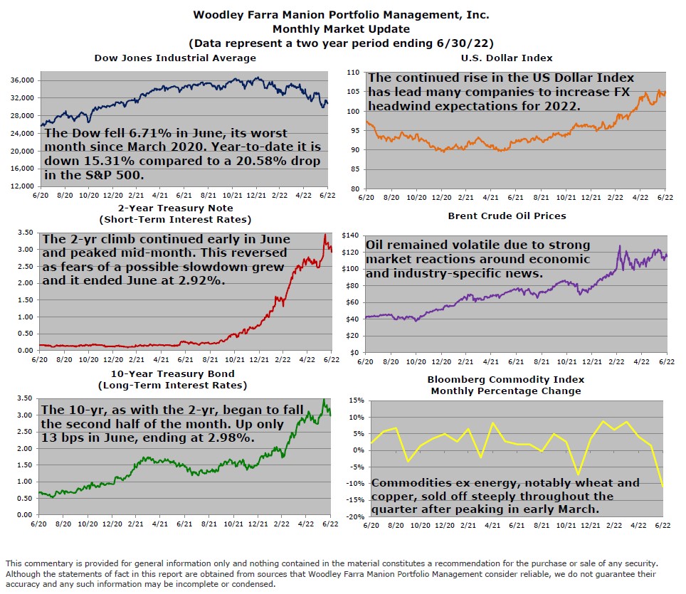 The second quarter was marked by broad declines in bond and stock prices as markets contend with rising interest rates and a weakening economic outlook. Last year, the economy and financial markets were riding a tailwind of stimulus in two forms: 1) significant deficit spending by the federal government and 2) ultra-low interest rate policies at the Federal Reserve. This year, the script has flipped, as tax revenues soar (up $768B so far in FY’22 vs. the year prior) while government spending recedes (down $870B) and the Fed gets serious about raising rates. Both conditions present headwinds to demand in the short run, slowing economic growth. Since prices are a function of supply and demand, in theory, inflation would eventually moderate with demand. But practice is messier than theory, and the government entity tasked with maintaining price stability, the Fed, only has blunt tools that cannot address supply-induced inflation. This puts the Fed in the challenging position of trying to slow demand enough to kill inflation without tipping the economy into a significant recession.