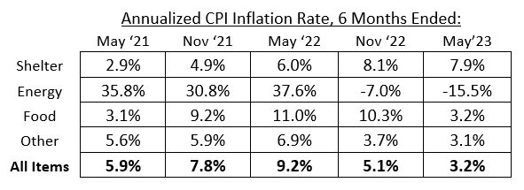 Inflation data has continued to improve since last fall. The 2022 stock market bottomed around the time core inflation (CPI ex-food & energy) peaked. Year-over-year inflation rates often receive the most attention, but below is a table of CPI growth over six-month periods (annualized) to provide a more current view of inflation. Notice the trend of disinflation (slowing inflation) in the last two periods versus accelerating inflation in the first three columns. Disinflation is providing markets greater confidence that the current rate hiking cycle could end soon. Consumers and companies are benefiting from normalizing inflation. Consumers are now seeing wages climb faster than inflation thanks in part to lower commodity prices. Stabilizing prices and improved supply chains are providing a boost to many companies’ profit margins and earnings. The U.S. dollar peaked in the fall of 2022 as the Ukraine war and ensuing energy crisis weighed heavily on currencies like the Euro and Pound. The U.S. dollar index has since declined ~10% from its peak, making multinational corporations’ foreign profits more valuable when translated back into dollars.