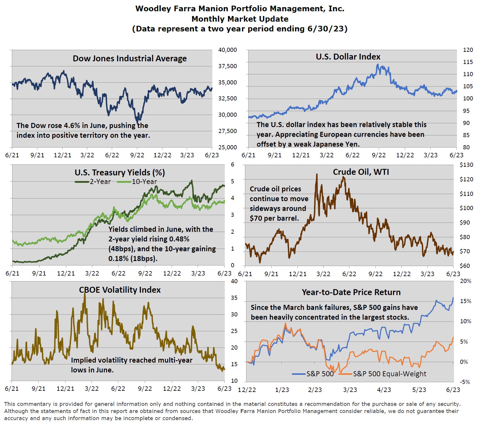 The S&P 500 stock market index rallied 8% in the second quarter, bringing year-to-date gains to 16%. The phrase “it’s a market of stocks, not a stock market” has perhaps never been more appropriate. The S&P 500 is market capitalization-weighted; meaning higher valuations hold larger weights in the index’s overall performance. More than 2/3 of the S&P 500’s gain in 2023 can be attributed to its seven largest constituents with the remaining 493 companies managing a modest return of ~5%. Broader participation among stocks and sectors is typically needed for a sustainable market rally. Continued resiliency for the U.S. economy and improving economic data in Europe could prove recessionary predictions overdone and lift a broader subset of stocks.