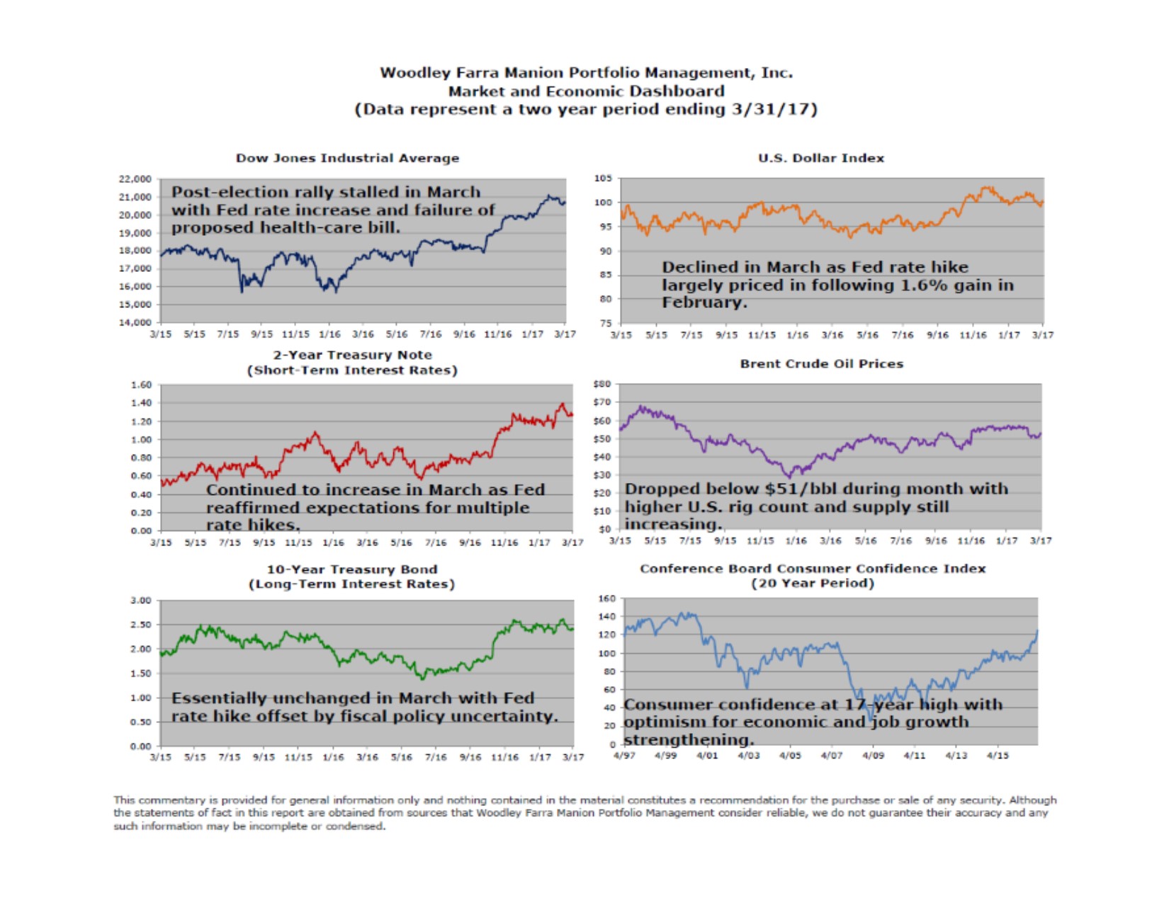 U.S. stocks continued to hit all-time highs during the first quarter, as optimism is high the economy will enter a faster phase of growth. Central to this theme is the new administration and Congress will enact legislation that will spur government spending (notably defense, homeland security and infrastructure), while reforming regulations, healthcare and taxes. Nothing notable has yet been achieved in Washington, but we expect the pace of legislation to pick up this spring and summer months.