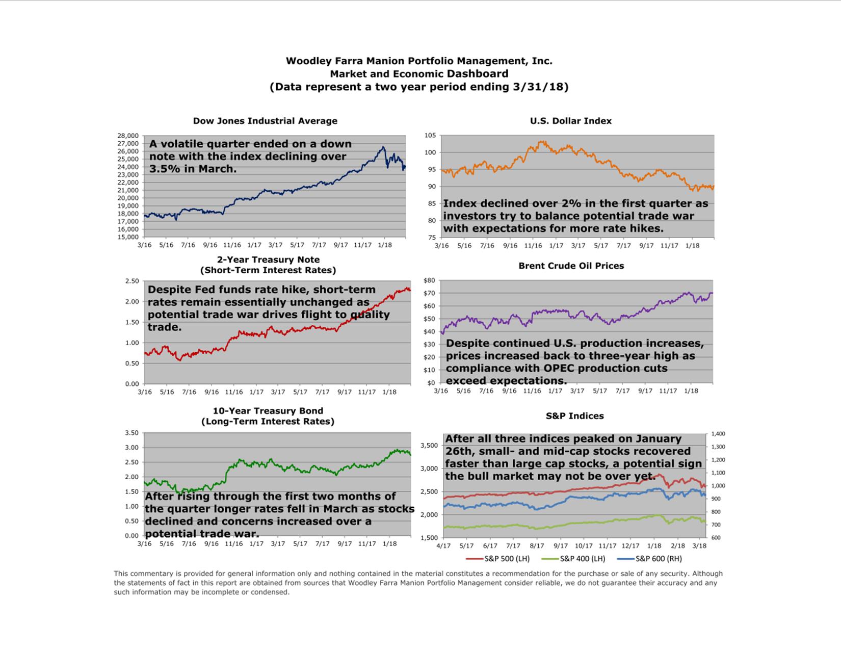 The first quarter of 2018 started off with a bang as stock market indexes climbed over 6% by January 26, one of the better starts to a new year. After a placid 2017, meaning little or no volatility, investors were spooked by the January labor report that suggested wage inflation was accelerating and the Federal Reserve would have to raise interest rates more than anticipated. This fear of higher interest rates triggered a month-long bout of selling, driving down the S&P 500 over 11% before recovering a good portion of this loss by mid-March. The rebound was short-lived, however, due to the fear of trade wars, which caused the S&P 500 to fall back to the closing low it made on February 8.