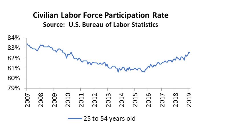 The chart to the left debunks the prediction of fewer people willing to work. In fact, the growth in the 25-54 year-old workers over the last four years has been a nice surprise. The longer-term trend of a lower participation rate will likely resume as more Baby Boomers finally retire. But more workers are helping economic growth and keeping inflation in check. And if inflation stays under 2%, the Fed can be patient and will not need to tighten monetary policy any further. Increasing immigration is one option to offset an ageing workforce. Improving worker productivity is the other factor needed to keep growth moving higher. Both are difficult to achieve in their own way. The current economy is doing well under present conditions.
