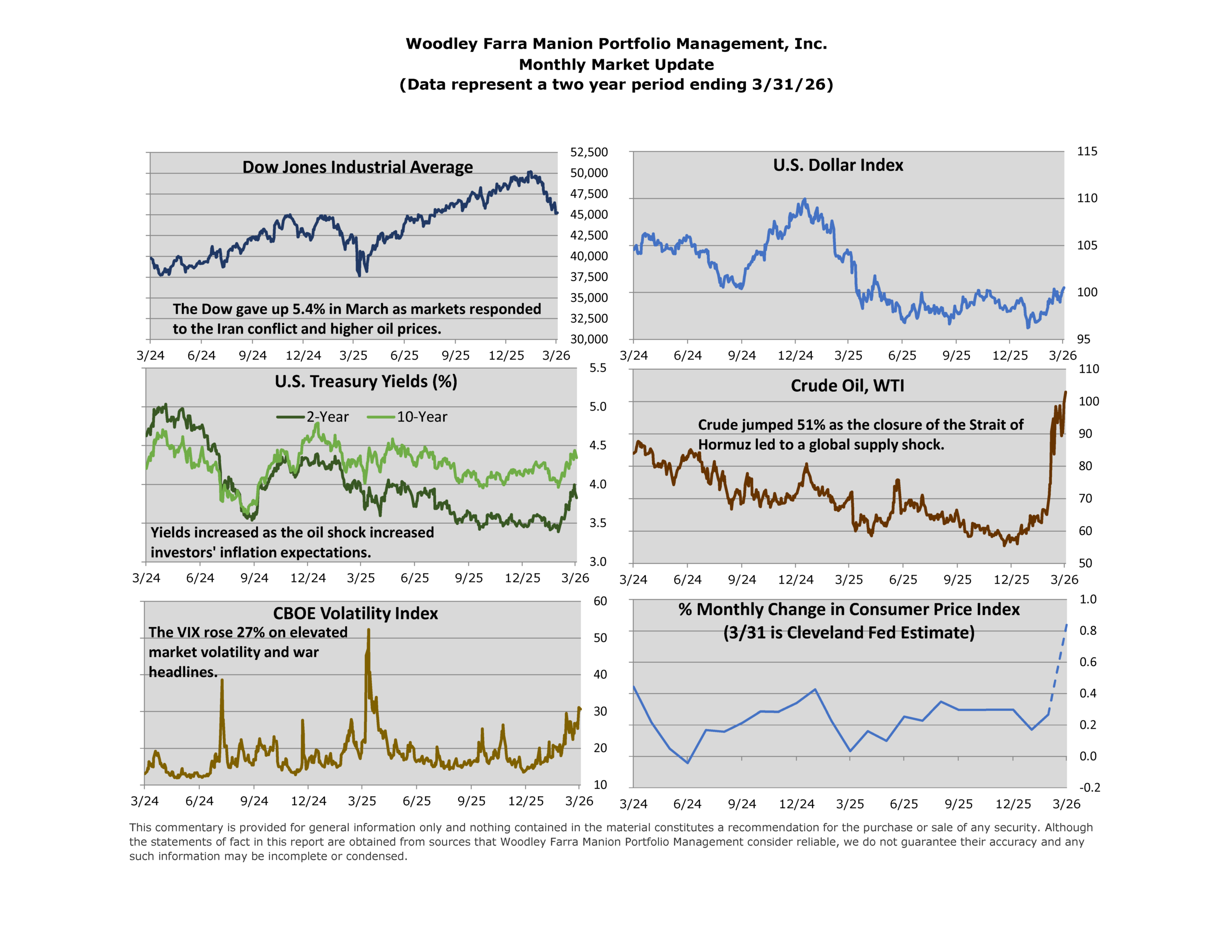 Stocks and bonds declined in March as conflict in the Middle East drove up prices for a broad set of commodities, from fertilizers and plastics to natural gas and oil. Pre-war, the Strait of Hormuz, handled roughly 20% of global crude oil and 20% of the world’s liquified natural gas (LNG). While global oil stockpiles are currently high, prolonged closure risks a sustained surge in energy prices. Because these commodities are widely used across the global economy, their price increases are powerful drivers of inflation. Consequently, the Cleveland Fed estimates that consumer prices rose 0.84% in March alone, which would mark the largest one-month jump in the Consumer Price Index since June 2022.