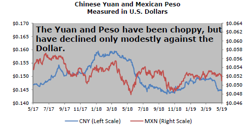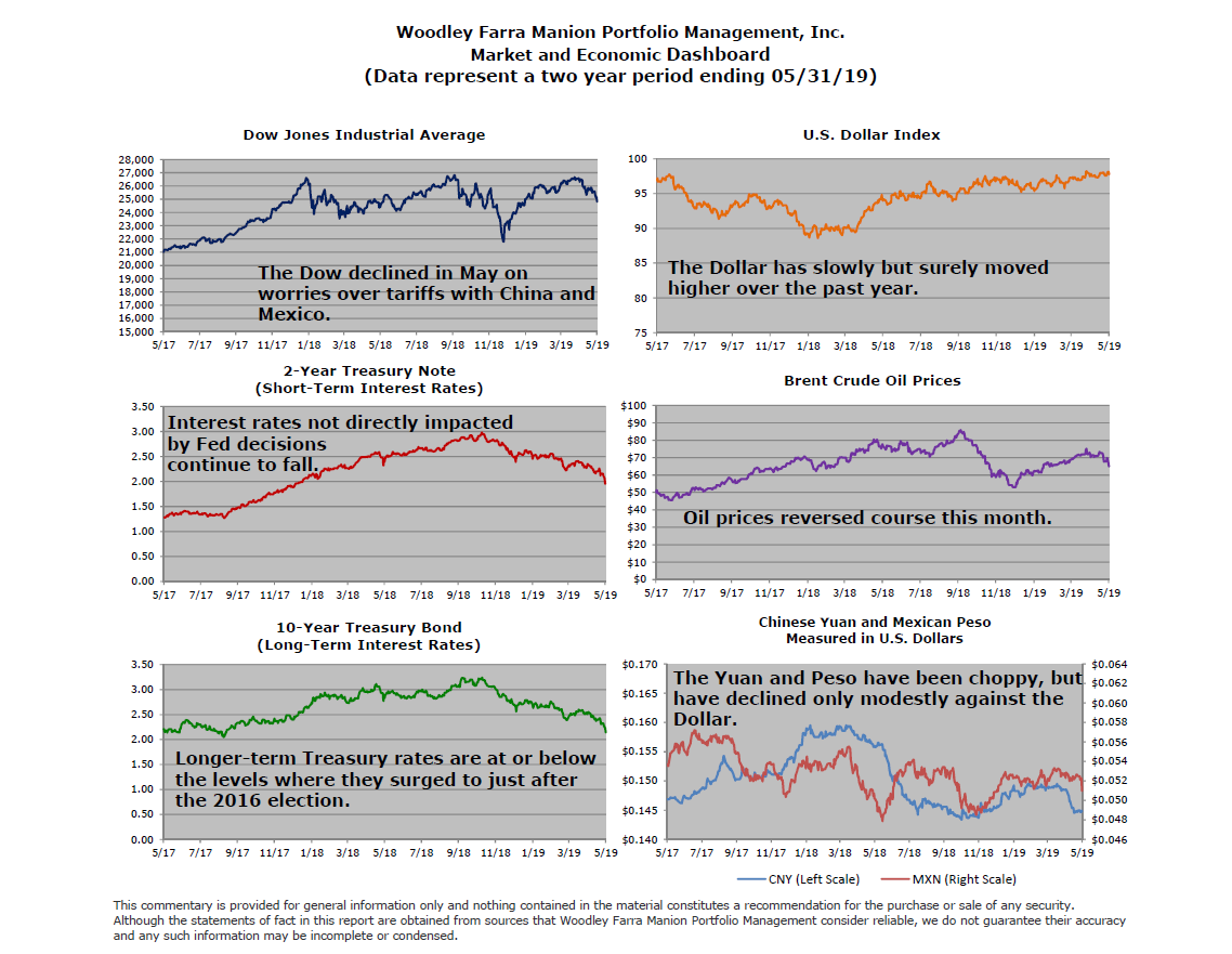 Rising trade tensions with China and a surprise threat to impose tariffs on Mexico (related to the migrant crisis on the southern border) derailed the stock market in May. Indeed, the Dow Jones 30 Industrials ended the month on its longest weekly losing streak in eight years. Investors are fearing the multi-front trade disputes will end the nine-year economic expansion.