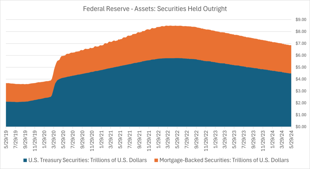 Stock indices climbed in May, with the S&P 500 and Dow gaining 4.8% and 2.3% respectively. U.S. Treasury yields ended the month relatively unchanged regardless of maturity. For the last two years, the Federal Reserve Bank has been reducing its holdings of U.S. Treasuries and Mortgage-Backed Securities (MBS) by limiting the reinvestment of maturities and principal payments. This policy is often referred to as balance sheet “runoff” or quantitative tightening and is carried out in an attempt to slow inflation. The Fed’s Treasury and MBS holdings peaked at over $8 trillion in 2022, more than doubling since the start of the pandemic, as the chart below shows. During the pandemic, the Fed bought Treasuries and MBS to stimulate the economy via lower interest rates and more liquidity. On May 1st, Fed Chairman Jerome Powell announced that the Fed would slow the pace of monthly runoff beginning in June, from a pace of $60 billion Treasuries and $35 billion MBS to $25 billion Treasuries and $35 billion in MBS. The slower runoff came as welcome news to markets, with stocks rallying following the announcement.