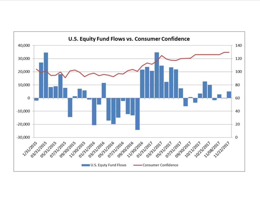 The contrarian indicator is just one of the many indicators that’s out there and is by no means perfect. In addition to fund flows some related indicators we track are the Consumer Confidence Index and the AAII Sentiment Survey which measures whether investors are bullish, bearish, or neutral about stock market returns over the next six months. Looking at the indicators allows us to see if investors are putting their money (Fund Flows) where their mouths are (Consumer Confidence, AAII Sentiment Survey).
