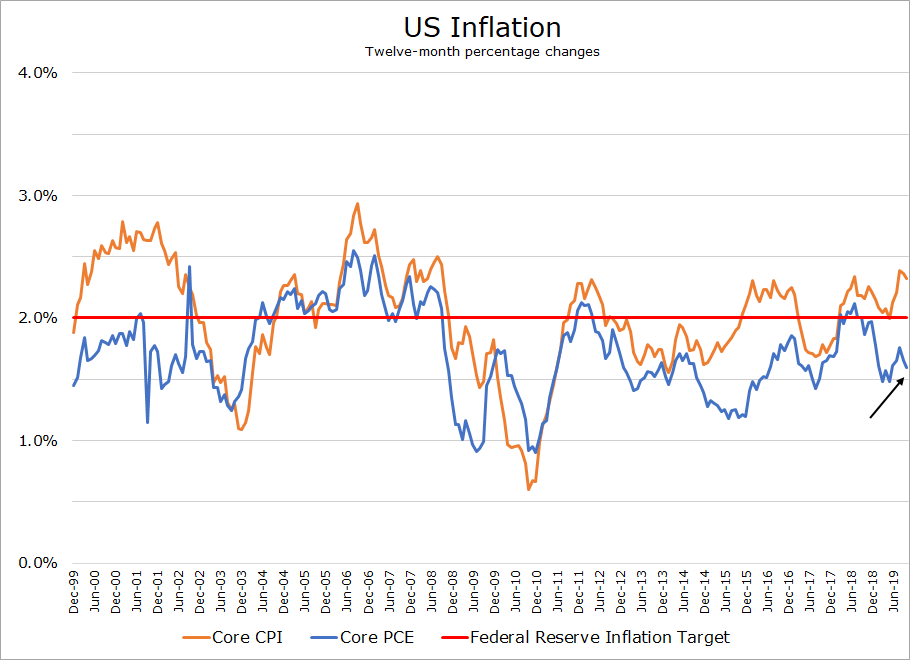 When discussing the Fed’s inflation targets, it is good to make the distinction between Consumer Price Index (CPI) and Personal Consumption Expenditures (PCE). The CPI is the index most widely followed and cited in new articles, but the PCE is the Fed’s main inflation gauge. The PCE is based on surveys of businesses as opposed to the CPI, which is a household-based survey. The PCE has generally been less volatile and has shown inflation to be lower than the CPI measure. As seen in the attached graph, the PCE came in at only 1.59% in the most recent release by the Bureau of Economic Analysis. Indeed, the core PCE (ex-food and energy) has been below 2% for most of the past 20 years.