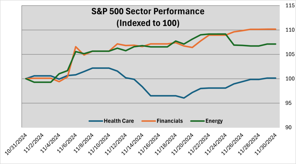 The beginning of November saw Trump retake the White House along with the Republican party taking control of both the House and Senate by slim margins. What followed has been coined the “Trump Trade,” as markets initially responded positively to the victory. The S&P 500 rose 5% from the 4th to the 11th before cooling down slightly through the rest of the month. However, not all industries held up as well as others. Big winners of the month included financials and energy stocks, which rose on expectations of more deal making on Wall Street and a potentially friendlier regulatory environment for the sectors. Notably, a loser of the “Trump Trade” was health care, which initially rallied upon the victory but later fell when Trump announced Robert F. Kennedy Jr. as his nominee to run the Department of Health & Human Services. RFK has a been a noted skeptic of vaccines and other aspects of the U.S. health care system, proposing tighter regulatory scrutiny within the industry. His potential confirmation in the Senate will be closely followed and may face hurdles.
