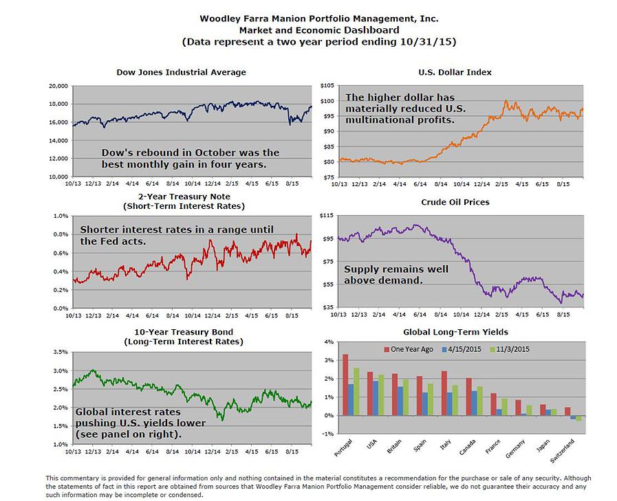 The stock market is now in the October-April time frame that usually produces the best returns for investors. After a sharp drop in the late summer, the market is now close to the highs established earlier in 2015. We’ll see if investors push prices to new highs, or use the rally to reduce their exposure. Since the safe government bond alternative offers poor value, maybe the rally will be durable and we’ll head into year-end on a positive note.