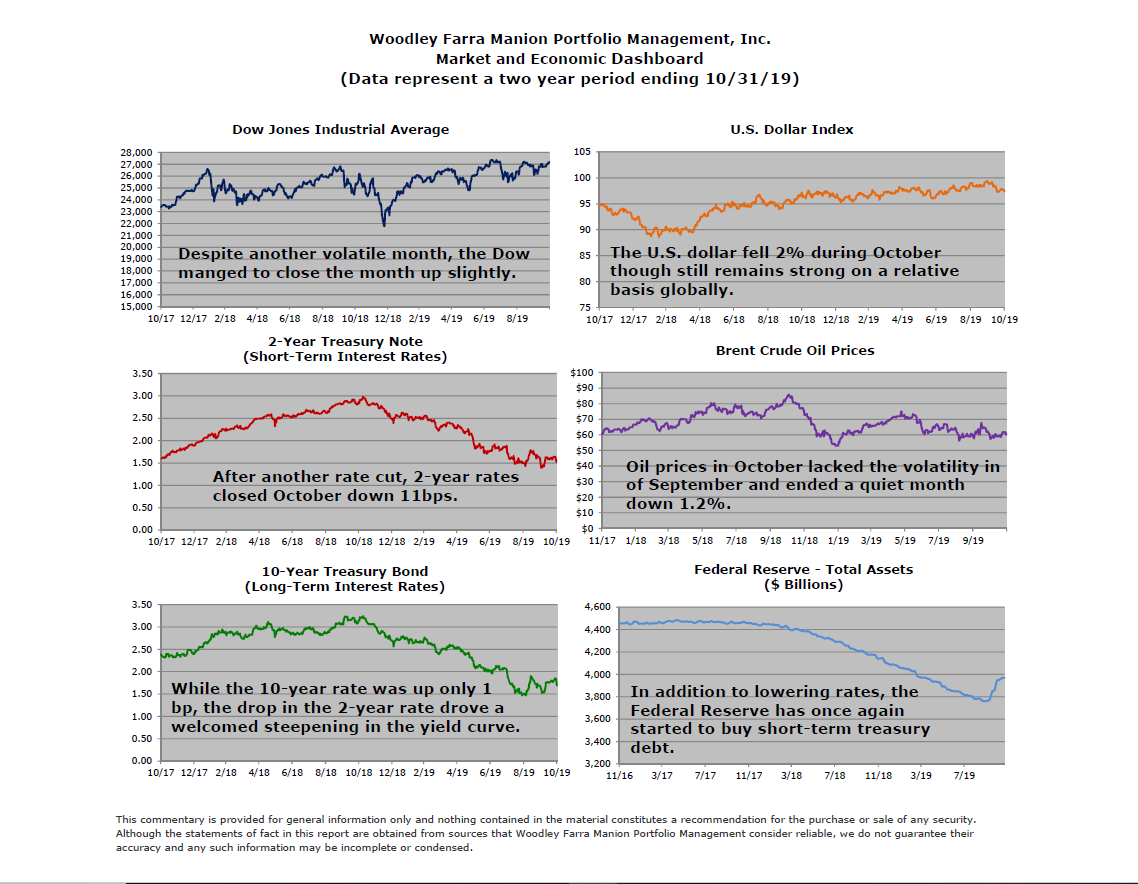 Much has been in the news and on the minds of investors about a weakening US economy. Several developments in October helped to temper these fears, leading to a 3.3% rise in the S&P 500. Trade talks showed some signs of positive momentum, with the US and China announcing a “phase one” trade agreement. Better than expected corporate earnings and economic data provided evidence that the narrative of the slowdown may have been overstated. Lastly, the Fed cut interest rates for the third time this year while increasing purchases of treasuries; both measures make credit easier to obtain and boost the money supply.