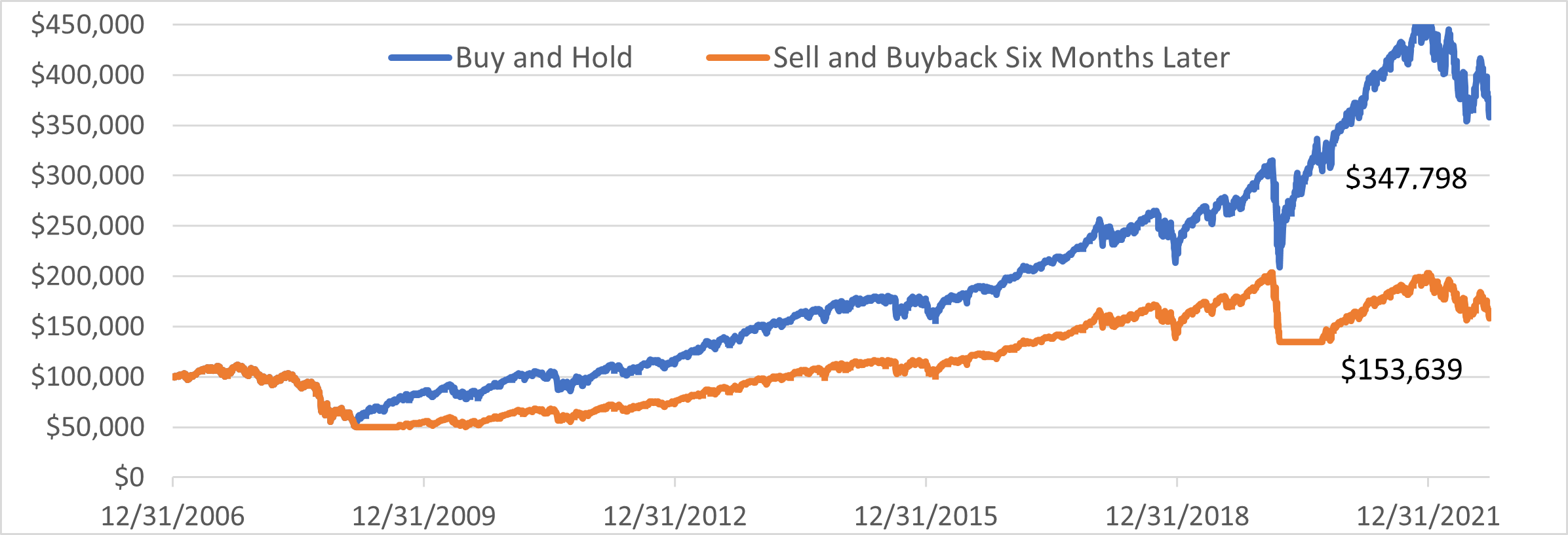 No one can predict when the stock market will finally bottom and reverse higher. Bear markets tend to be short and sharp or long, drawn-out affairs; this decline qualifies as the latter. Markets find a bottom when valuations are too attractive for buyers to pass up. We do believe the bulk of this decline has occurred. Cash on hand should be deployed systematically into stocks with strong fundamentals, seasoned management, and attractive valuations. History shows that market timing is a fool’s errand that carries significant risks. One of the most destructive decisions an investor can make is riding the market down, selling that locks in losses, and failing to get back in during the recovery. The 15-year chart below compares a buy and hold investment in the S&P 500 (blue, 12.2% annualized total return) to an investor who sold at the lows of the Great Financial Crisis and the COVID pandemic (orange, 4.0% annualized total return). This pattern has been repeated following every bear market since 1929.