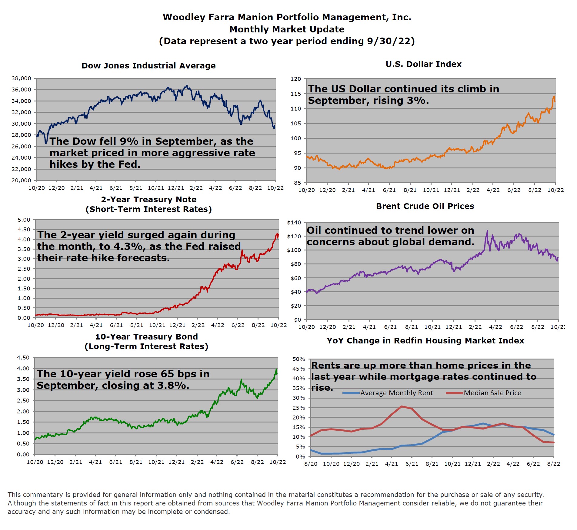 The stock market had a significant rally in the first half of the third quarter, followed by another leg down in late August & September that took the major indices back to mid-June lows. Hawkish comments by the Fed regarding inflation pressures caused treasury interest rates to reach 12-year highs.