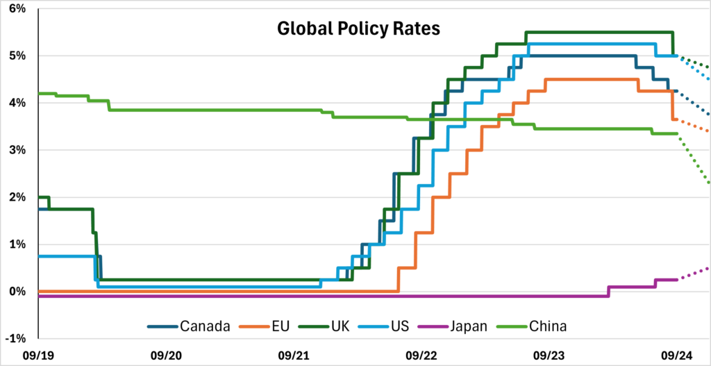 Financial assets posted a strong third quarter, with the S&P 500 up 5.89% and the Bloomberg US Aggregate Bond index up 5.20%. Globally, central banks have begun cutting rates due to reduced inflation and rising unemployment risks. The graph below demonstrates how many of the world’s major economies’ interest rates are influenced by one another. Through year-end, Canada is expected to cut its policy rate to 3.75%, the EU 3.40%, the UK 4.75%, the US 4.50%, and China 2.30%. Japan is the exception, expected to raise its rate 25 basis points to 0.50%, but the country’s