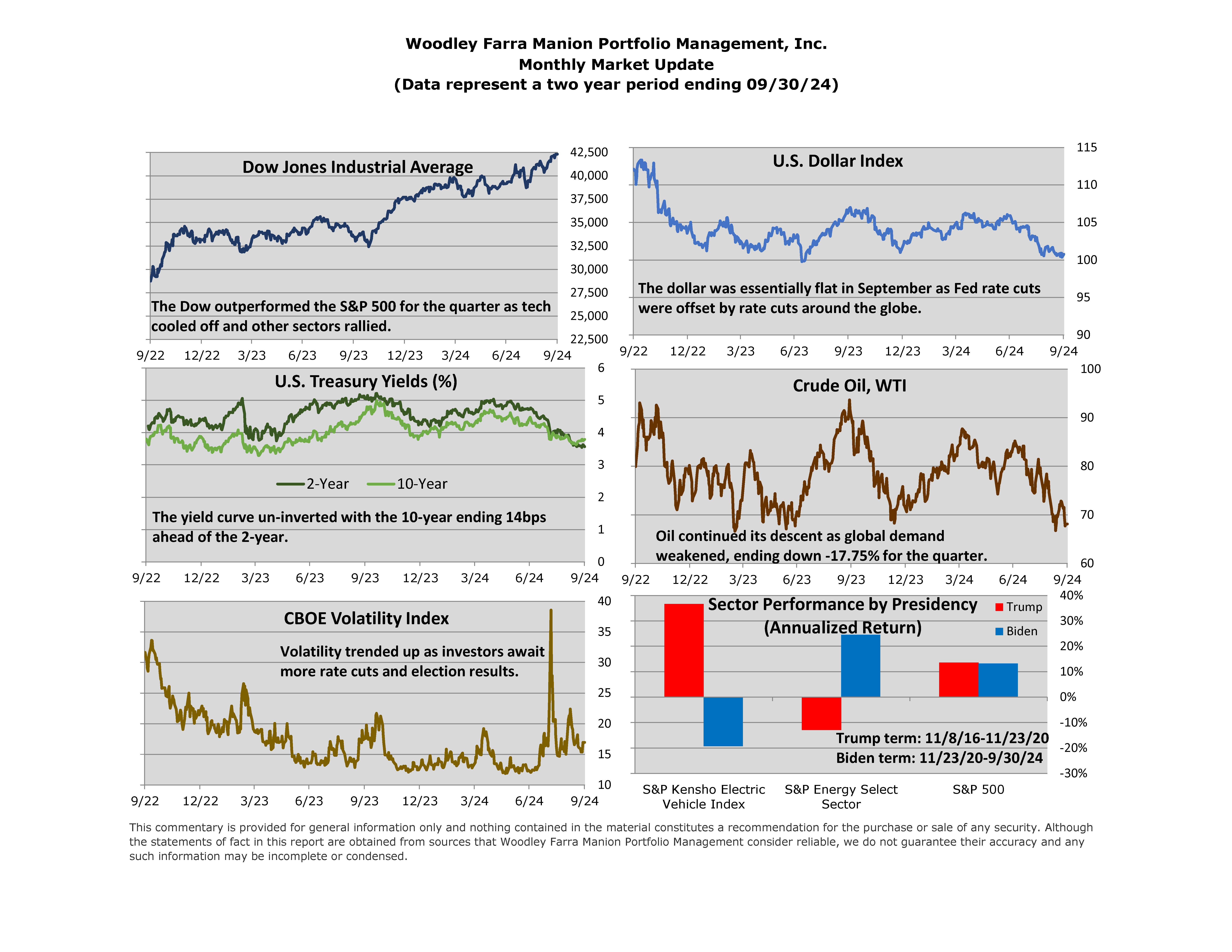 Financial assets posted a strong third quarter, with the S&P 500 up 5.89% and the Bloomberg US Aggregate Bond index up 5.20%. Globally, central banks have begun cutting rates due to reduced inflation and rising unemployment risks. The graph below demonstrates how many of the world’s major economies’ interest rates are influenced by one another. Through year-end, Canada is expected to cut its policy rate to 3.75%, the EU 3.40%, the UK 4.75%, the US 4.50%, and China 2.30%. Japan is the exception, expected to raise its rate 25 basis points to 0.50%, but the country’s