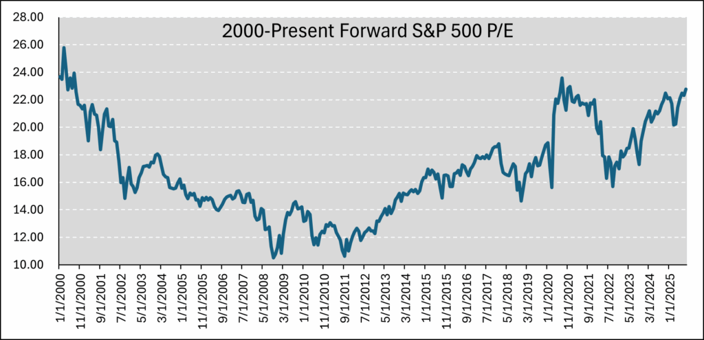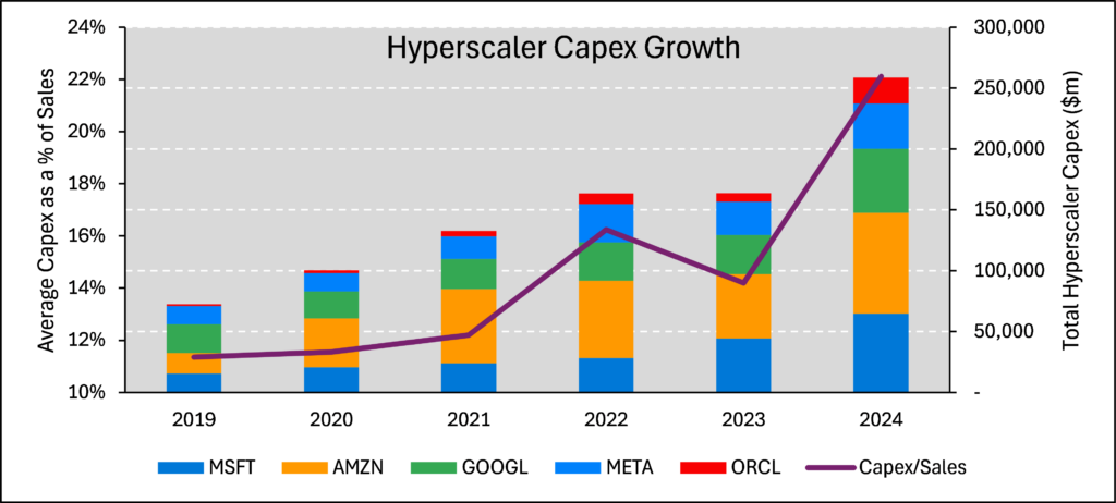 Lately, meme stocks, unprofitable tech, crypto companies, and AI names have seen huge gains largely from speculative bets. In AI, some of the biggest names, like OpenAI’s Sam Altman, have raised concerns. Altman was quoted as saying “Are we in a phase where investors as a whole are overexcited about AI? My opinion is yes.” He went on to stress the long-term innovative nature of AI and suggested overoptimism mainly applies to competitors with weak fundamentals. Mark Zuckerberg, CEO and founder of Meta (Facebook), recently said he would rather overspend by hundreds of billions than come up short in the AI race. This FOMO is adding fuel to the massive capital expenditure growth among the AI “hyperscalers.” The average hyperscaler, which consists of Microsoft, Amazon, Alphabet (Google), Meta, and Oracle, has doubled their capital expenditure as a percentage of sales from about 11% five years ago to 22% today. Rising capital expenditure rewards investors when the returns on said investments follow suit. The question today is if this massive wave of investment can yield the returns necessary to justify current valuations. Fiber optic/internet infrastructure investment in the 1990s was in the hundreds of billions, but resulted in excess capacity, deflationary pricing, and poor returns for investors in the 2000s. Investors were correct about a bright new technology (the internet), but many lost tremendous amounts of money nonetheless.